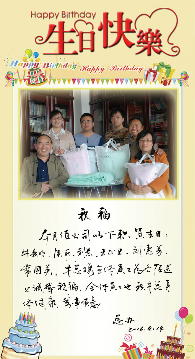 本月值公司以下员工生日:牛春明、侯丽、刘慧、王正卫、刘慧芳、常国英。牛总携全体员工为各位送上诚挚的祝福。全体员工也助牛总身体健康、万事如意。